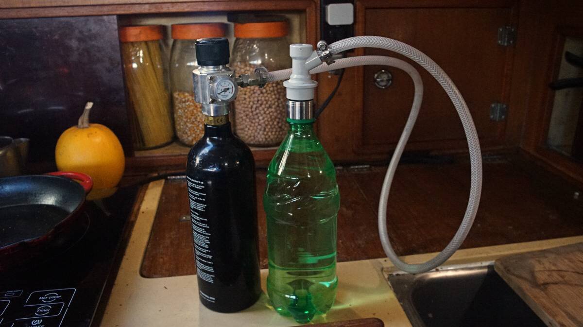 We do enjoy having some fizzy water now and again. Carbonation elevates aroma and produces an appealing mouthfeel often described as "tingling". Because we lack refrigeration aboard Pino, in the summer carbonated water feels cold even if it isn't.