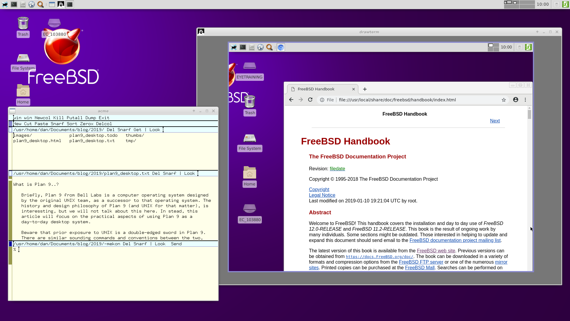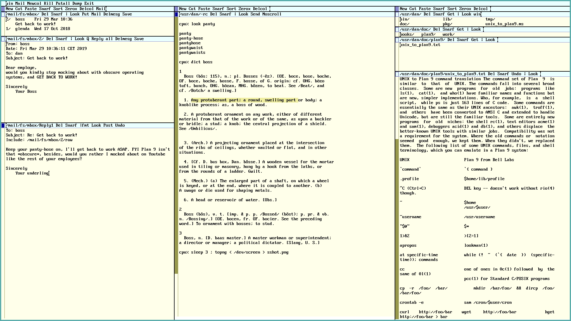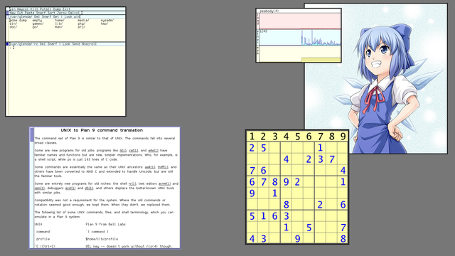 Hopefully, this article has also demonstrated that Plan 9 does not suck quite so badly as you may have thought. I know I was positively surprised a few times as I was writing it! Thanks to the good work of the 9front developers, you can run Plan 9 on modern hardware. Most of the laptops I have tried it on have just worked, including essential things like audio and wifi. As we have seen, you can do office work, play games and audio, work with images and the web. And with the recent additions of a fairly decent music player, video player and web browser, 9front is actually starting to look, if not good exactly, then not so shabby at least, as a casual desktop. Of course the real charm of Plan 9 has always been in its simple and consistent design, which gives the user tremendous power with modest efforts. Using it will likely open your mind to the power of UNIX, much more so in fact, then UNIX itself will. Happy hacking :)