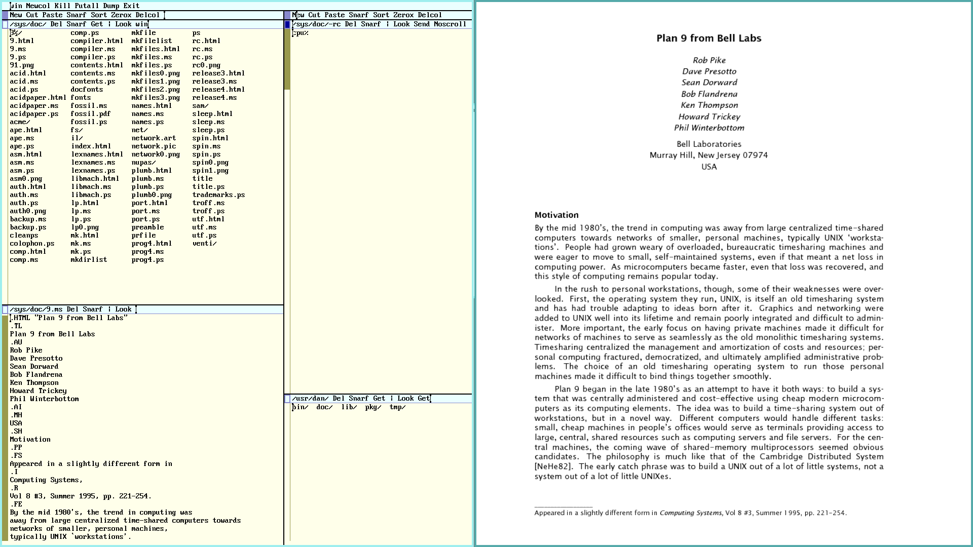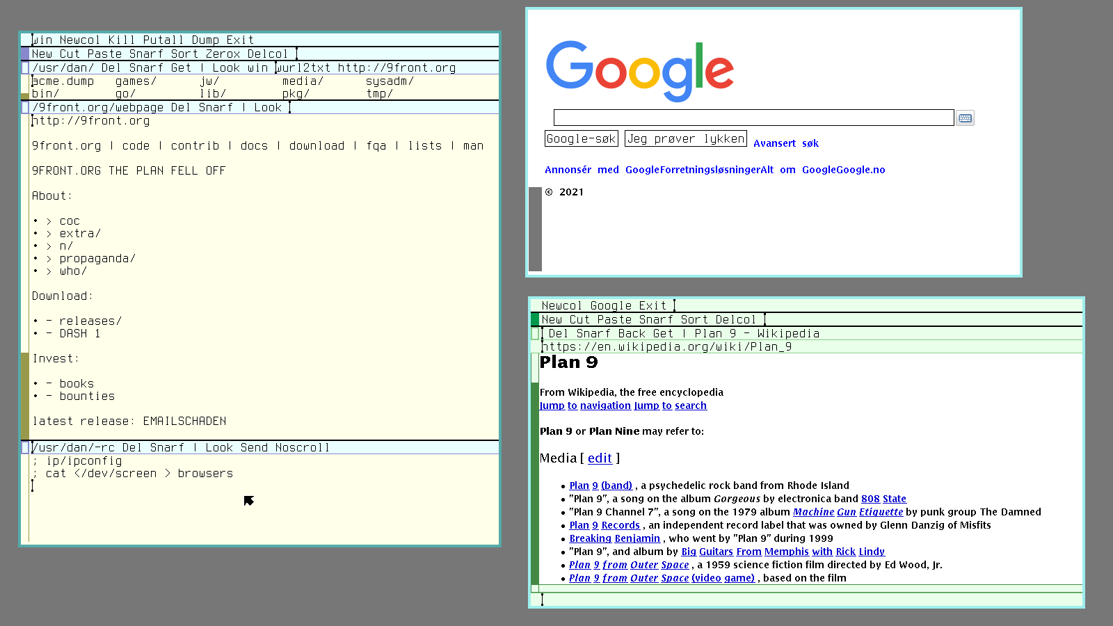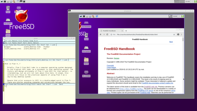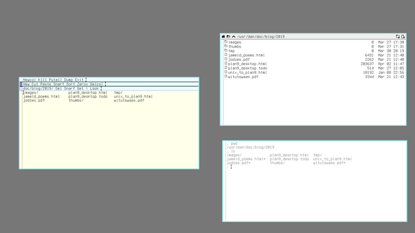 Briefly, Plan 9 from Bell Labs is a computer operating system developed by the original UNIX design team. After decades of work on Research UNIX in the late 80's, the team decided to write a new operating system from scratch, Plan 9 was finally released in 1992, and a few years later they released yet another operating system called Inferno, which share many of the same characteristics as its sister project. These systems, and variations thereof, have more or less been in continual development since. The history and design philosophy behind these operating systems, is interesting, but we will not talk about that here. Instead, this article will focus on the practical aspects of using Plan 9 as day-to-day desktop system.