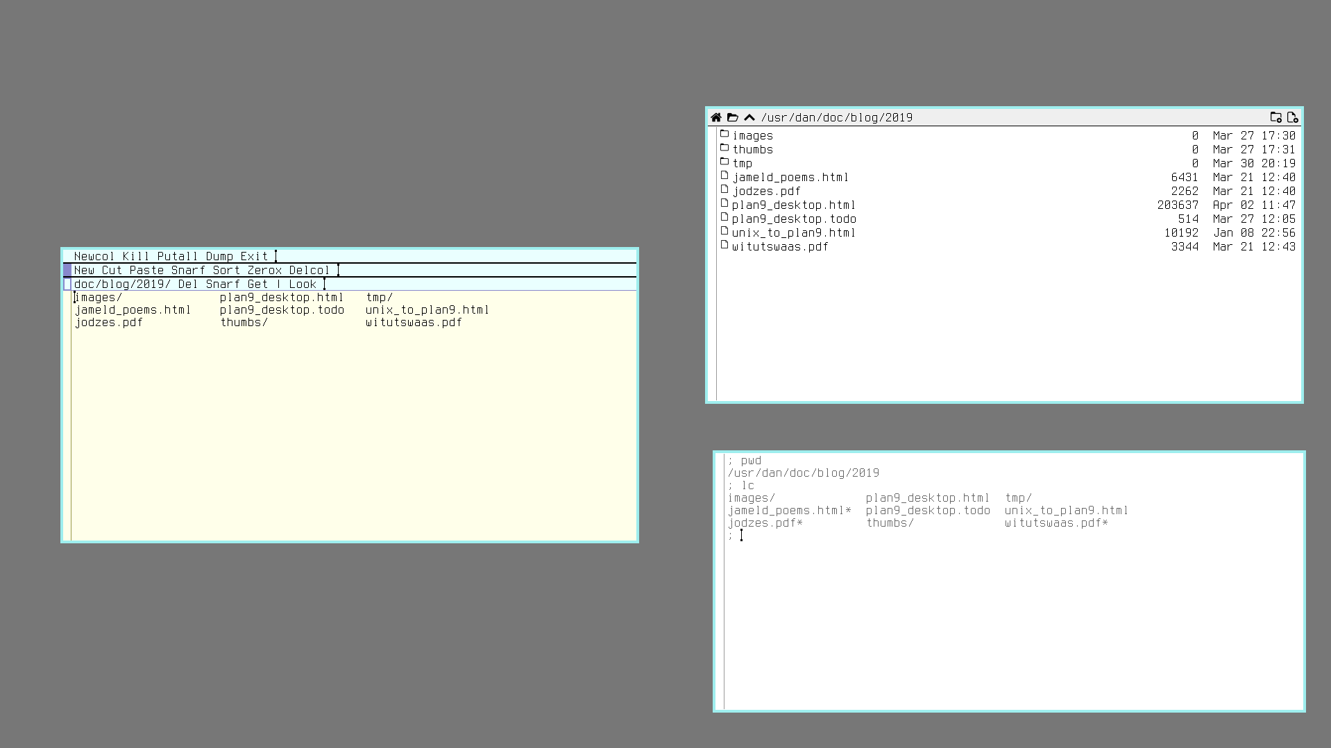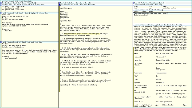 The third thing you may notice is that the terminal text can be freely edited. You can add any text anywhere and copy paste the text arbitrarily, the Plan 9 terminal thus feels much more like a text editor then a UNIX terminal (a consequence of this free-form text editing is that the mouse cursor has to be put at the end of the last line in order to execute a command with the Return key, otherwise it will just add a literal newline to the text - this is only mildly annoying once you get used to it). What's the point of this novel design? First of all it eliminates a host of special purpose programs that UNIX requires, for example there is no clear command in Plan 9, you just cut the text. There is no reset or readline either, as they are not needed. Secondly, once learned, this behavior feels very intuitive. Why shouldn't you be able to cut and paste text and freely sprinkle your terminal output with random comments? Going back to a UNIX terminal, after having spent some time in Plan 9, really feels like leaving the 90's - and going back to the 70's (fun tip: check out /bin/hold to see how a basic text editor in Plan 9 can be written in just five lines of shell script!).