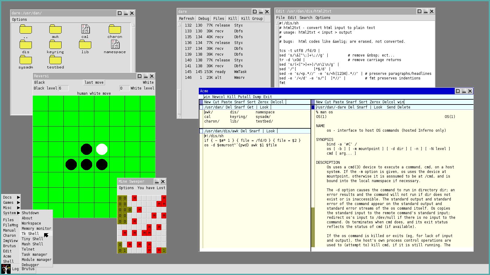 The window manager in Plan 9 is called rio, it provides a remarkably clean and simple desktop, somewhat akin to twm in UNIX. Unlike twm though, it doesn't look like crap by default, and the source code is only 6000 lines of code, which incidentally is also about the same size as Plan 9's graphical library, libdraw. In contrast twm's source is closer to 30,000 lines, and the X Window System backend, more then 8 million!