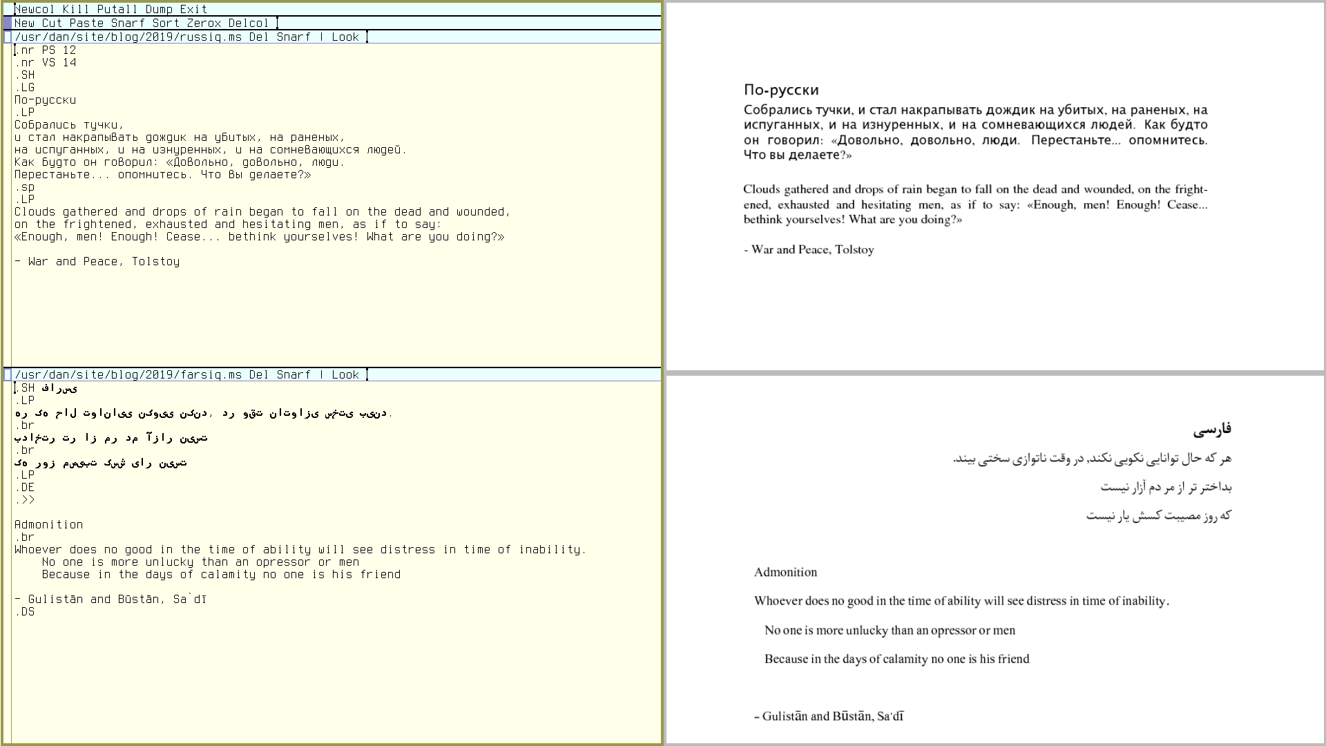 If you middle-click Newcol a new column will appear. The column has it's own row of commands, in the second blue row. Delcol will delete the column. Cut, Paste and Snarf (eg. "Copy"), will do text manipulations. But it's easier to use mouse chords for this: Left and middle-click to Cut, Left and right-click to Paste, and finally Left and middle-click, then right-click to Snarf, or Copy. The mouse chords are awkward to explain, but try it out, it will feel very intuitive with a little practice.