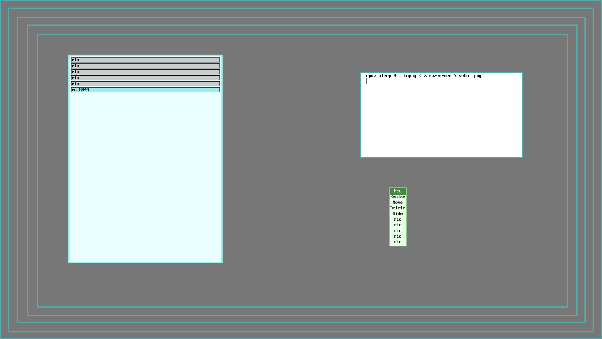 You can now run workspaces and switch to a new "workspace" with Win+n (where Win is the Windows key, between the left Ctrl and Alt keys, and n is a number between 0 and 9). You can also move windows about with Win+Arrow, or resize them with Win+Shift+Arrow (see riow(1) and bar(1) for more info). Classic Plan 9 does not have these tools, although there is an old fork of rio called rio-virtual, that does include virtual workspaces. There are also ways to create such services without the 9front extensions: You'll note that all windows in all riow "workspaces" are listed in the rio menu and can be unhidden. This is because riow doesn't actually add workspaces as such, but rather provides a clever way of hiding and unhiding groups of windows, and thus gives you the illusion of workspaces. For a similar, but more simplistic, way to do this see the rio scripting section below.