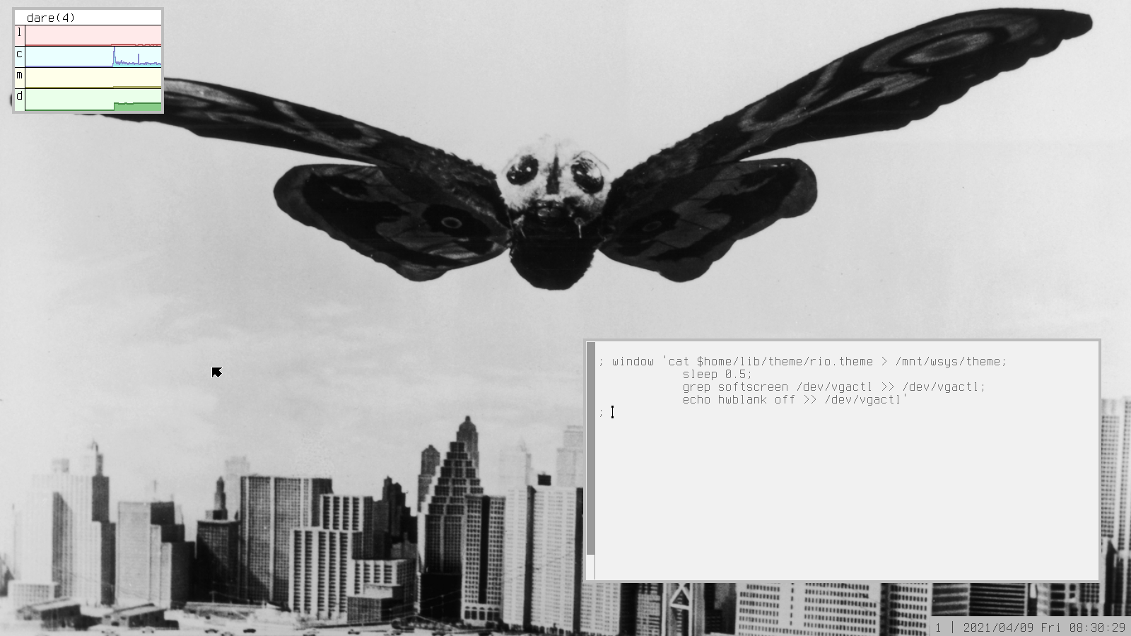 Unlike UNIX, graphical programs executed in a Plan 9 terminal will not launch a new window, rather, the terminal will morph into this new program. In other words, running the PDF/Image viewer page, or the web browser mothra in a terminal for instance, will in no way effect window placement. So having an initial window placement that works on your desktop, will significantly reduce the need for automatic window tiling. But if you need that, take a look at the rio scripting section below.